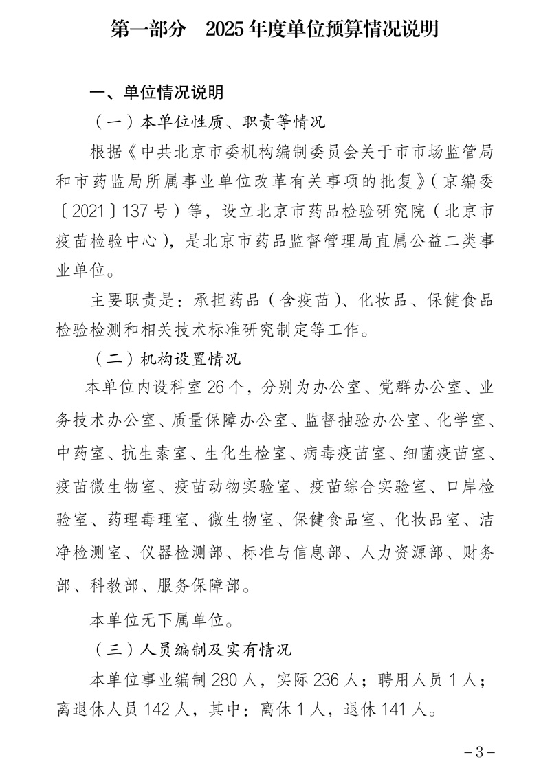 北京市药品检验研究院(北京市疫苗检验中心)2025年预算情况的说明